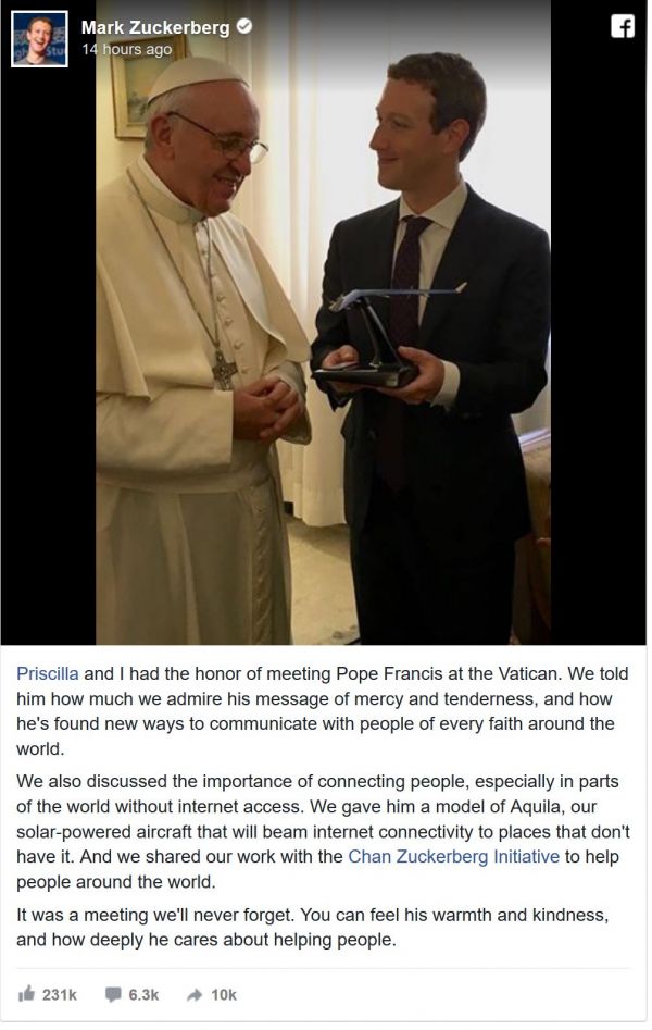 آقای زاکربرگ همچنین مدلی از پهپاد "آکویلا" را که با انرژی خورشید کار می کند به پاپ فرانسیس هدیه داد. وی قرار است عصر روز دوشنبه در یک نشست پرسش و پاسخ در رم شرکت کند.
