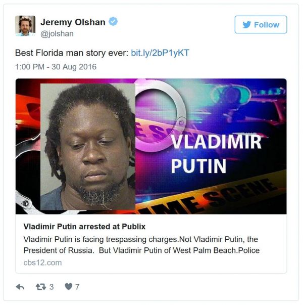 ولادیمیر پوتین در آمریکا دستگیر شد اما نه پوتینی که در روسیه مشغول وظایف ریاست جمهوری است، بلکه ولادیمیر پوتینی که در منطقه وست پالم بیچ در ایالت فلوریدای آمریکا با اتهام ورود بدون اجازه به ملک رو به رو است.در شبکه های اجتماعی تصویر این مرد منتشر شده است.