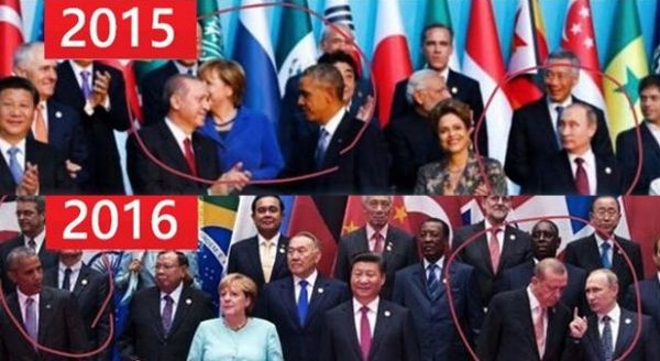 العربیه - نشستها و مواضع تغییر میکنند، اما عکسها به عنوان شاهد تاریخگو میمانند. این زبان حال نشست گروه ۲۰ است که چهارم ماه سپتامبر جاری، در چین برگزار شد. نشست پیشین هم سال گذشته در آنتالیای ترکیه برگزار شد. این دو نشست شاهد مواضع و روابطی بود که تغییر کرد به ویژه مواضع و روابط روسای جمهوری ترکیه، آمریکا و روسیه.کسی که به عکسهای دو نشست و آمادگی رهبران شرکت کننده برای گرفتن عکس گروهی نگاه میکند، بدون شک تغییر مواضع آمریکا، ترکیه و روسیه را میبیند. دادن اولویت به بهبود روابط با روسیه به جای آمریکا به وضوح در عکسها به چشم میآید، به ویژه پس از آنکه رجب طیب اردوغان رئیس جمهوری ترکیه، از حادثه سرنگونی جنگنده بمبافکن روسی، عذرخواهی کرد.