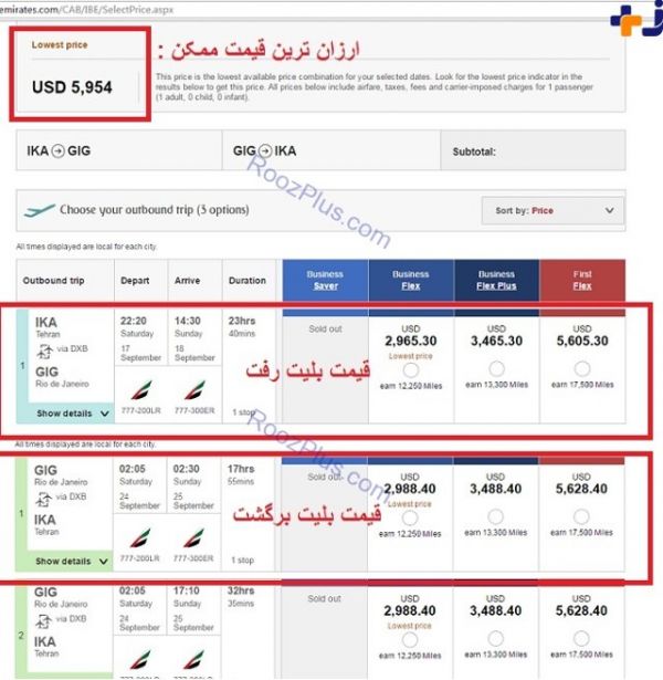 همان طور که در ادامه مشاهده میکنید قیمت پرواز کلاس تجاری هواپیمایی امارات از تهران به مقصد ریو دو جانیرو برزیل در ارزان ترین قیمت که در کابین سوم انجام میشود معادل 5954 دلار قیمت دارد که این میزان با توجه به کابین پروازی میتواند به بیش از 11 هزار دولار معادل 38 میلیون تومان برسد که مجموع آن برای این 5 نماینده به مبلغی نزدیک به 200 میلیون تومان می رسد .