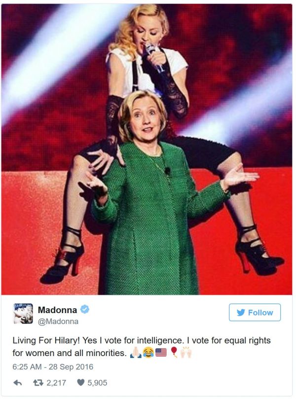 مدونا در شبکه های اجتماعی بارها حمایت خود را از هیلاری کلینتون نشان داده است. در یکی از پست های خود هم گفته، «بله من به هوش رأی می دهم، به حقوق برابر برای زنان و اقلیت ها رای می دهم.»