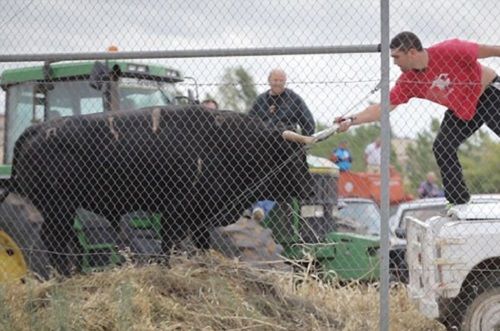 در نهایت، وقتی که گاو از نفس افتاد تراکتوری به زمین آورده میشود و گاو را دور زمین میکشد.