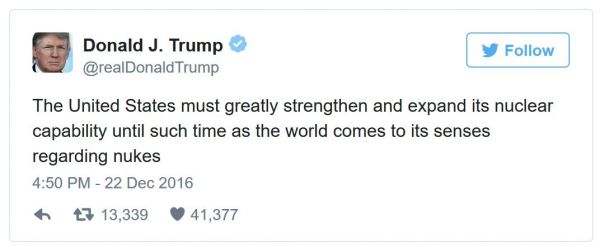 دونالد ترامپ روز پنجشنبه در توییتر خود نوشته است: ایالات متحده (آمریکا) تا زمانی که جهان در مساله هستهای بر سر عقل بیاید، میبایست به طور عمده توانایی هستهای خود را تقویت کرده و گسترش دهد.»