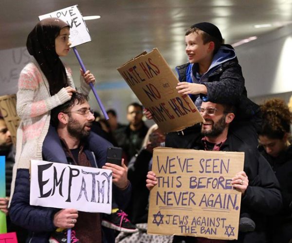 دو خانواده مسلمان و یهودی کنار هم در تظاهرات علیه فرمان ترامپ