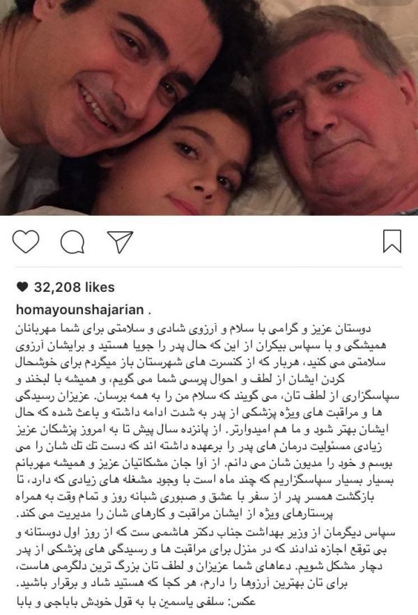همایون شجریان، در تازهترین پست اینستاگرامی خود، از مراقبتها و رسیدگیهای پزشکی و بهتر شدن حال پدرش خبر داد.به گزارش خبرگزاری خبرآنلاین، همایون شجریان عکسی از خودش و دخترش (یاسمین) در کنار استاد شجریان منتشر کرد.