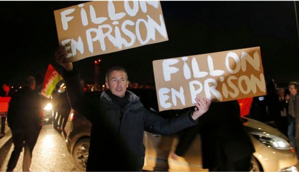 معترضی با پلاکاردی که خواستار زندانی شدن آقای فیون است. خبرگزاری فرانسه از حمله پلیس برای بازداشت فرانسوا فیون نامزد انتخابات ریاست جمهوری فرانسه خبر داد.در حالیکه آقای فیون از شانس های اصلی انتخابات اردیبهشت فرانسه است، ماجرای اتهام پرداخت او به همسرش موجب پیگرد قضایی او شده است.