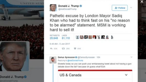 ترامپ در دومین نوشته توئیتری خود توجیه صادق خان را مردود دانست آقای ترامپ این نظر شهردار لندن را مورد انتقاد قرار داد و نوشت: "در حمله تروریستی دست کم هفت نفر کشته و چهل وهشت نفر زخمی شدهاند و شهردار لندن میگوید که دلیلی ندارد مضطرب شوید!" در واکنش به این پیام، صادق خان و سخنگوی او گفتند که با توجه به شرایط کنونی، شهردار کارهایی مهمتر از پاسخ گویی به نظرات رئیس جمهوری آمریکا دارد.موضعگیری رئیس جمهوری آمریکا با واکنش انتقادآمیز شماری از مقامات و فعالان سیاسی در بریتانیا مواجه شد و ترزا می، نخست وزیر نیز با قدردانی از اقدامات شهرداری، تلویحا حمایت خود را از اقای خان ابراز داشت. همچنین، سفارت بریتانیا در واشنگتن پیام توئیتری کفیل سفارت را منتشر کرد که در آن آمده است: "در حالیکه شهردار لندن پس از این حمله نفرت آور شهر را به پیش هدایت میکند، من از رهبری استوار او قدردانی میکنم."