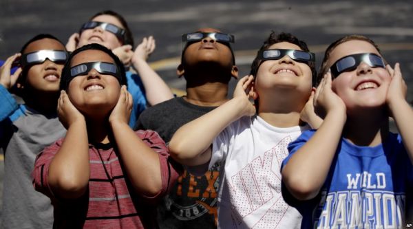 گروهی با عینک های مخصوص سرگرم تماشای خورشید گرفتگی در آمریکا.