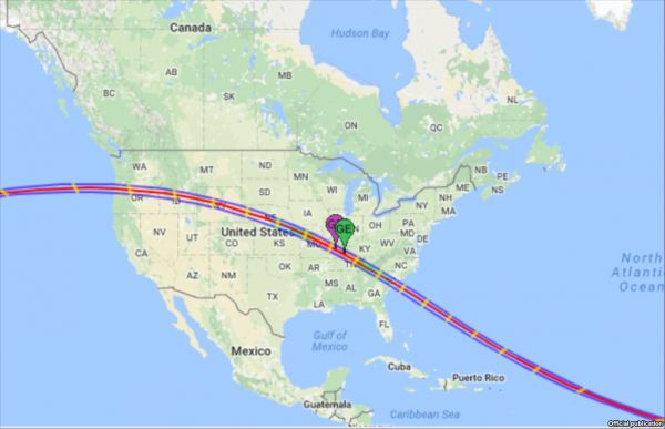این خورشیدگرفتگی از غرب آمریکا در ایالت اورگان شروع و در عصر در شرق آمریکا در کارولینای جنوبی پایان یافت.