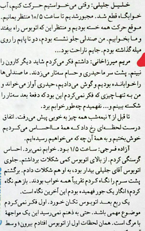 اما حالا پس از 20 سال که از تصادف اتوبوس دانشجوهای شریف می گذرد و ۵۰ روز از مرگ مریم میرزاخانی. این بار اتوبوس حامل دانش آموزای دختر برگزیده ی هرمزگان، راهی اردوی فرزانگان بود و اخبار تلخش که به گوش می رسد از کشته شدن، قطع نخاع، قطع عضو دانشجویان خبر می رسد.