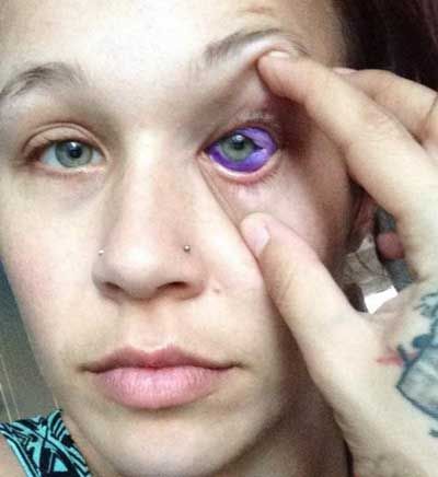 «کات گالینگر» اهل اوتاوا که ۲۴ ساله است در عملی عجیب اقدام به رنگ کردن و تاتو مردمک چشمش کرد. او قصد داشت رنگ سفید مردمک چشمش را به رنگ بنفش تغییر دهد.