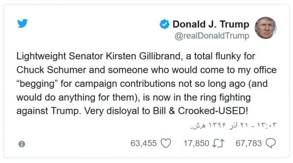 آقای ترامپ نوشت: "سناتور سبک وزن، کریستین جیلیبرند، نوکر چاک شومر است و کسی است که همین چند وقت پیش آمد به دفتر من و برای دریافت کمک مالی به ستاد انتخاباتیاش داشت "گدایی" میکرد (و میگفت حاضر است در برابر این کمک حاضر است هر کاری بکند)، ایشان حالا به حلقهای پیوسته که میخواهند با ترامپ بجنگند."