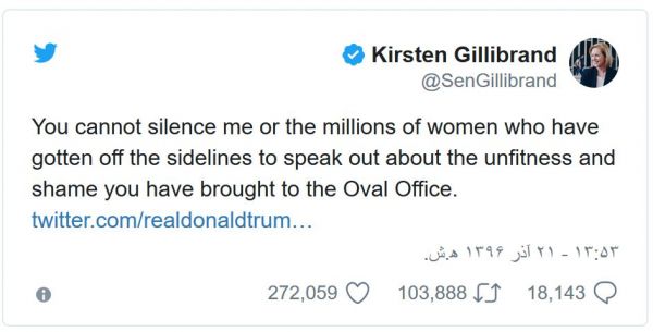 خانم جیلیبرند در پاسخ به توییت امروز آقای ترامپ نوشت: "شما نمیتوانید من و میلیونها زن دیگر را که با شجاعت گام پیش گذاشتهاند تا درباره نادرستیها و شرمی که به علت حضور شما دامن کاخسفید را گرفته است خفه کنید."همزمان ریچارد بلومنتال، سناتور دموکرات منتقد رئیس جمهور ایالات متحده گفته: "آمریکا باید در برابر این تهمتهای جنسیتزده ترامپ بایستد و آن را محکوم کند".