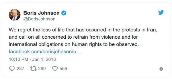 به گزارش رویترز، بوریس جانسون در فیس بوک خود نوشته است: بریتانیا از نزدیک رویدادهای ایران را زیر نظر دارد. معتقدیم که می بایست گفت وگویی معنی دار درباره خواسته های مشروع و مهمی که معترضان مطرح می کنند، انجام شود و ما نگاه می کنیم که مقام های ایران اجازه چنین گفت و گویی را بدهند.