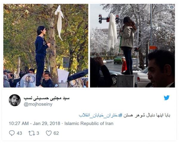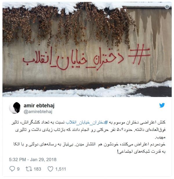 یک کاربر توئیتری با نام «حسین وی» در تحسین این اقدام نوشته است: «دختران_خیابان_انقلاب کلیدواژهی دوران تازهی تاریخ ایران خواهد بود. چه باشکوه و معنادار است که کلید رهایی این سرزمین از استبداد، در دست این زنان جوان باشد. از شادی و هیجان در پوست خودم نمیگنجم».