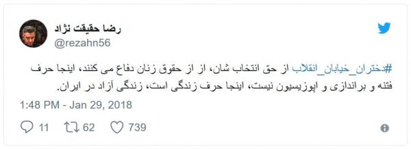 رضا حقیقتنژاد، روزنامهنگار خارج از کشور هم توئیت کرده است: «دختران_خیابان_انقلاب از حق انتخابشان، از از حقوق زنان دفاع میکنند، اینجا حرف فتنه و براندازی و اپوزیسیون نیست، اینجا حرف زندگی است، زندگی آزاد در ایران».