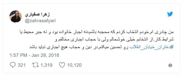 زهرا صفیاری، کاربر دیگری است که گفته، «چادری» است و این انتخاب خودش بوده که «محجبه» باشد، «نه اجبار خانواده بود و نه جبر محیط یا شرایط کار. از انتخابم خیلی خوشحالم ولی با حجاب اجباری مخالفم و #دختران_خیابان_انقلاب رو تحسین میکنم. در دین و حجاب هیچ اجباری نباید باشد».