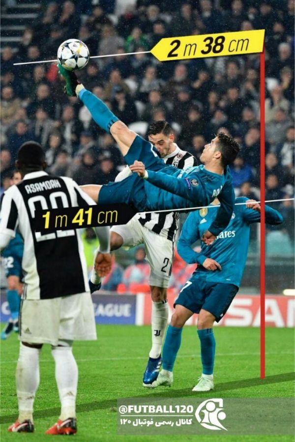 این گل رونالدو نکته آماری کم نداشت ولی مهم ترین آن قطعا پرش بی نظیر این فوق ستاره پرتغالی بود که همه را به حیرت واداشت. فاصله توپ با زمین در زمانی که رونالدو ضربه را زد دقیقا 2متر و 38 سانتی متر و فاصله پشت بدن و او با زمین 1متر و 41 سانتی متر بود.