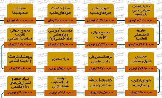 وزارت خزانهداری میزان پرداختی به موسسه پژوهشی خمینی که زیر نظر محمدتقی مصباح یزدی اداره میشود را ۱ میلیارد و ۱۴۵ میلیون تومان اعلام کرده است. همچنین یک میلیارد و ۱۰۵ میلیون تومان به مجمع جهانی تقریب مذاهب و یک میلیارد و ۲۲۳ میلیون تومان به مجمع جهانی اهل بیت پرداخت شده است.