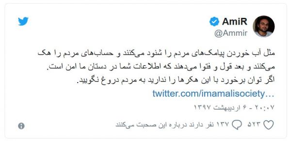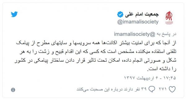 امیر رشیدی، پژوهشگر دسترسی به اینترنت در کمپین بینالمللی حقوق بشر در ایران، اعتقاد دارد پیامکهای اعضای جمعیت امام علی "شنود" شده است: "این اولین بار نیست، و مخابرات ایران در سه سال گذشته بارها پیامکها را برای دست یافتن به رمز احراز هویت شنود کرده است، حتی تلگرام به همین دلیل و با فشار ما، قبول کرد رمز دوم را به ایمیل بفرستد، اما کاربران از پیامک برای احراز هویت جیمیل خود استفاده میکنند که باعث میشود از راه جیمیل حساب تلگرام هم هک شود."