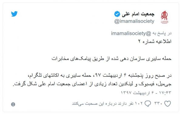 موسسه خیریه جمعیت امام علی میگوید حسابهای کاربری مختلف گروهی از اعضایش به صورت "سازماندهی شده" هک شده است موسسه خیریه امام علی، سازمانی غیر انتفاعی که برای کمک به زنان و کودکان آسیبپذیر در ایران کار میکند، اعلام کرده است که حسابهای کاربری مختلف گروهی از اعضایش "به صورت سازماندهی شده" هک شده است.به گفته این موسسه، حسابهای هک شده شامل جیمیل، فیسبوک، توئیتر و لینکدین و تلگرام بوده است. همه کسانی که حسابهایشان هک شده از خدمات "ورود دو مرحلهای" استفاده میکردهاند.