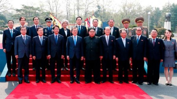 هیئتهای شرکت کننده در نشست رهبران دو کره - کیم و مون نفرات ششم و هفتم از سمت راست ردیف جلو- کیم جونگ-اون، ۳۴ ساله، با دیدن رئیس جمهوری کره جنوبی خطاب به او گفت که "از اینکه ما در این محل تاریخی ملاقات میکنیم خوشوقتم و اینکه شما تمامی راه را برای استقبال از ما به اینجا آمده اید برایم ارزشمند است." مون جائه-این، ۶۵ ساله، در پاسخ گفت که "تصمیم بزرگ شما بود که باعث این ملاقات شد." آقای مون سپس از رهبر کره شمالی دعوت کرد که از خط مرزی - که با یک بلوک بتونی طولانی مشخص شده - عبور کند و به خاک کره جنوبی قدم بگذارد و دو رهبر، در حالیکه دست یکدیکر را گرفته بودند از خط مرزی عبور کردند و کیم وارد خاک کره جنوبی شد.بخشی از برنامه این دیدار شامل کاشتن نهال توسط رهبران دو کره به نشانه صلح و دوستی بود.