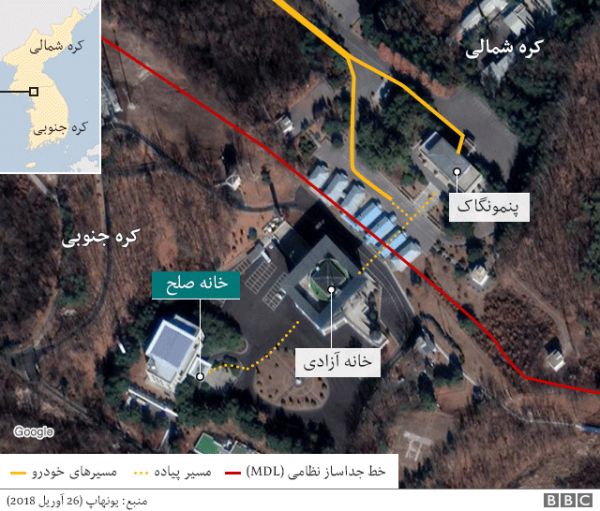 لحظه دیدار تاریخی رهبران کره شمالی و جنوبی در مرز دو کره دیدار یک روزه کیم جونگ-اون، رهبر کره شمالی، از کره جنوبی و مذاکرات او با مون جائه-اون، رئیس جمهوری کره جنوبی پایان یافته و دو طرف بیانیهای در مورد نتیجه این مذاکرات منتشر کردهاند.روز جمعه، ۷ اردیبهشت (۲۷ آوریل)، کیم جونگ-اون، رهبر کره شمالی با عبور از مرز دو کره، مورد استقبال مون جائه-این، رئیس جمهوری کره جنوبی قرار گرفت و مذاکرات دو طرف در ساختمان "خانه صلح" در روستای پانمونجوم در منطقه غیرنظامی بین دو کره آغاز شد. در بیانیه پایانی این دیدار، دو طرف اعلام کردند که به غیراتمی شدن شبهجزیره کره متعهد هستند و همچنین تمایل خود را به امضای معاهده صلح اعلام داشتند.
