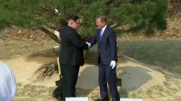 مون و کیم و درخت صلح و دوستی این نخستین بار از زمان پایان جنگ دو کره در سال ۱۹۵۳ بوده که یکی از رهبران کره شمالی وارد خاک کره جنوبی میشود. در سالهای ۲۰۰۰ و ۲۰۰۷ میلادی، رهبر وقت کره شمالی با رئیسان جمهوری وقت کره جنوبی ملاقات کرد اما این ملاقات در پیونگ یانگ، پایتخت کره شمالی انجام شد.دور اول مذاکرات کیم و مون حدود ظهر به وقت محلی خاتمه یافت و هیئت کره شمالی برای صرف نهار به آن سوی مرز رفت و دور دوم پس از نهار برگزار شد.