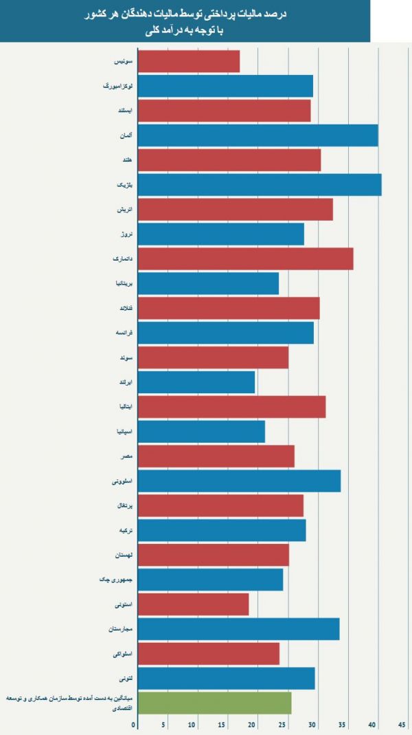 یورونیوز : بنا بر گزارش سازمان همکاری و توسعه اقتصادی، کارکنان طبقه متوسط در ثروتمندترین کشورهای جهان حدود یک چهارم دستمزد خود را به عنوان مالیات پرداخت میکنند.مالیات دهندگان بلژیک با پرداخت ۴۰.۵ درصد از دستمزدشان، بیشترین بار را در این زمینه بر دوش میکشند و پس از آنها مالیات دهندگان دانمارک و آلمان قرار دارند که ۳۵ درصد از کل دستمزدشان به حساب خزانه داری دولت واریز میشود.
