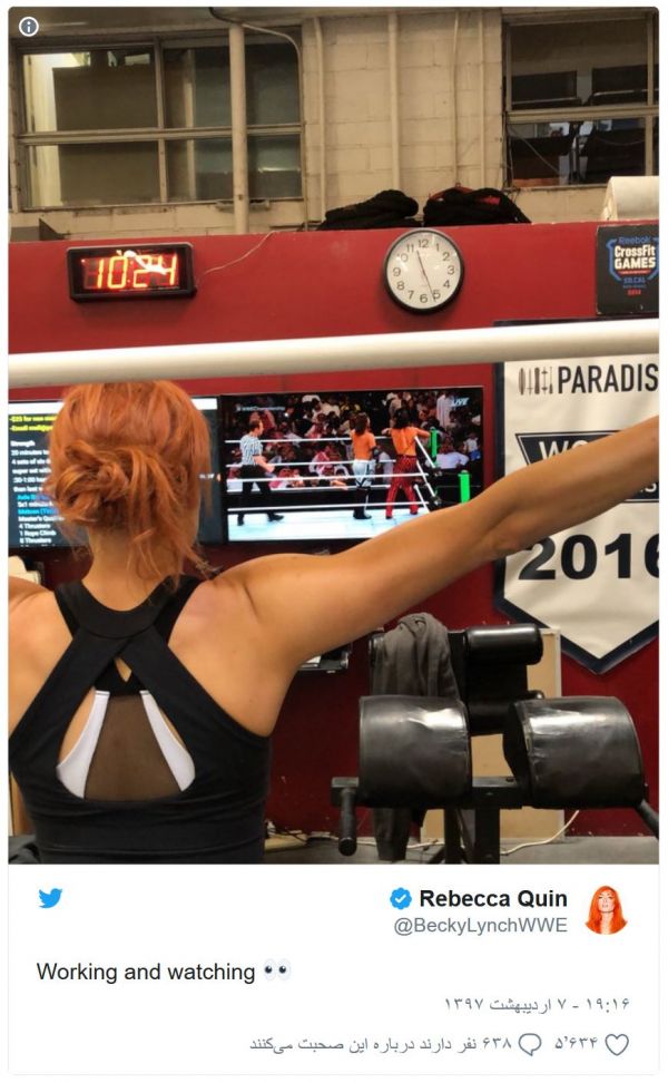ربکا کوئین، یکی از ستارگان زن در کشتی کچ، در توییتی عکسی از خودش گذاشته که در حال تمرین در باشگاه، دارد این برنامه را تماشا میکند: