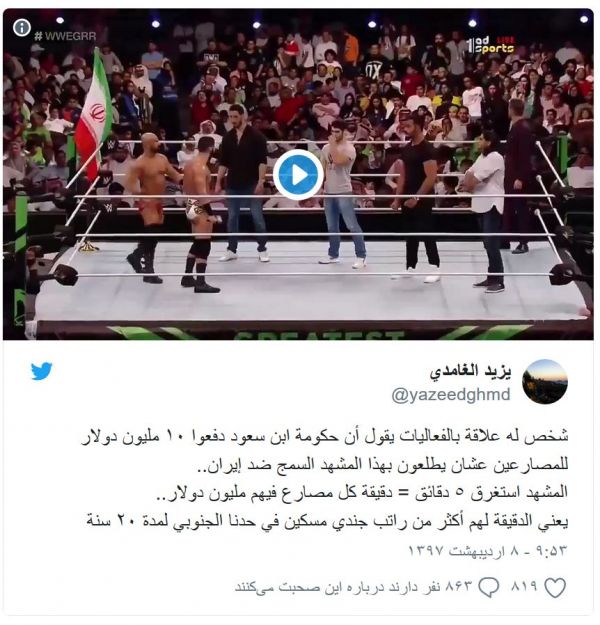 یک کاربر منتقد حکومت سعودی هم با انتقاد از هزینه چنین برنامهای نوشت: "کسی که با این مسابقات سر و کار دارد میگوید که دولت ابنسعود ۱۰ میلیون دلار به این دو کشتیگیر داده تا این صحنه زشت را علیه ایران راه بیندازند. کل این صحنهسازی ۵دقیقه طول کشیده یعنی هر کشتیگیر، دقیقهای یک میلیون دلار گرفته. یعنی در یک دقیقه بیشتر از حقوقی دریافت کردهاند که یک سرباز بیچاره طی ۲۰ سال در مرزهای جنوبی ما میگیرد."