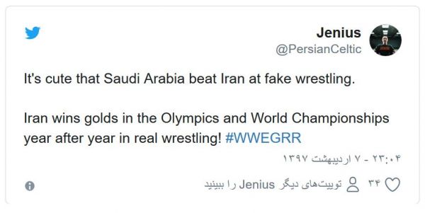 از جمله این کاربر ایرانی که در توییتش نوشت: "بانمک است که عربستان سعودی در یک کشتی الکی، ایران را شکست میدهد. ولی ایران در کشتی واقعی، هر سال در المپیک و مسابقات جهانی کشتی مدال طلا میبرد!"