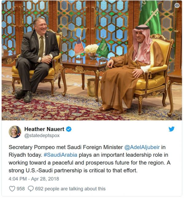 در این راستا هدر نائرت سخنگوی وزارت خارجه آمریکا با انتشار توییتی ضمن اعلام خبر ورود مایک پمپئو به ریاض نوشته که عربستان سعودی برای دستیابی به آیندهای صلحآمیز و پر رونق در منطقه نقش رهبری را ایفاء میکند.