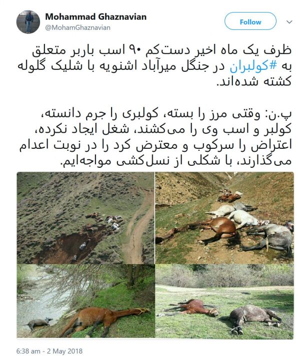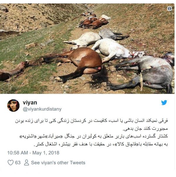 انتشار تصاویری از کشتار دهها اسب باربر «متعلق به کولبران» در مناطق مرزی کردستان که گفته میشود توسط «نیروهای انتظامی» صورت گرفته است، خشم کاربران شبکههای اجتماعی را برانگیخت.روزنامه ایران در گزارشی به موضوع کشته شدن این چهارپایان در جنگلهای امیرآباد شهرستان اشنویه پرداخته است. کریم علیزاده، فعال محیط زیست میگوید که در ماه گذشته سه نوبت و هر نوبت دستکم ۳۰ اسب باربر متعلق به «کولبران» در این منطقه از پای درآمدند.