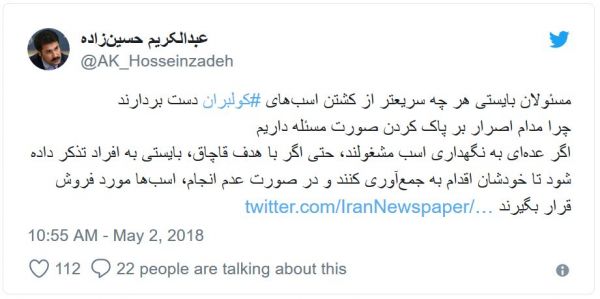 عبدالکریم حسنزاده، نماینده مردم نقده و اشنویه در مجلس ایران در حساب توئیتری خود با محکوم کردن کشتار این حیوانات، آنرا پاک کردن صورت مساله خواند و گفت: «اگر عدهای به نگهداری اسب مشغولند، حتی اگر با هدف قاچاق، بایستی به افراد تذکر داده شود تا خودشان اقدام به جمعآوری کنند و در صورت عدم انجام، اسبها مورد فروش قرار بگیرند.»