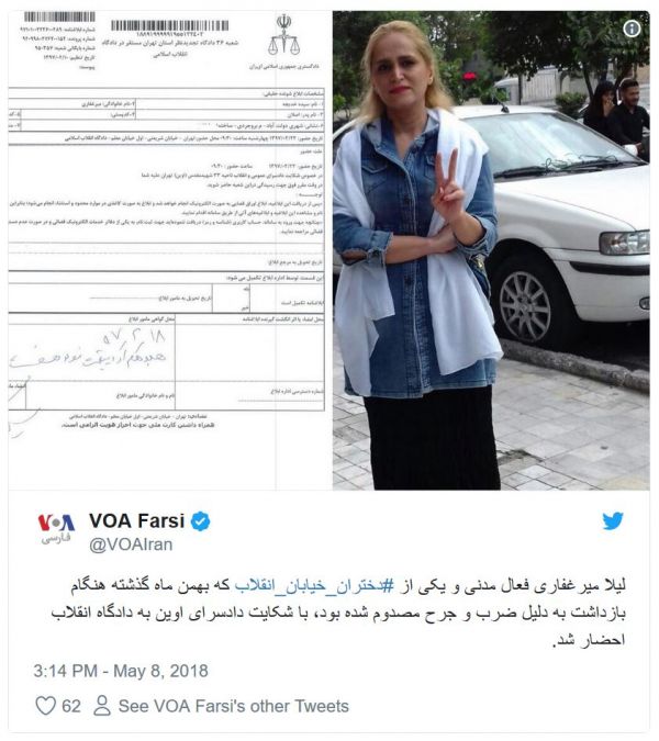 صدای آمریکا :خانم غفاری بهمن ماه گذشته با ایستادن روی یک سکوی برق و برداشتن روسری خود، نوشته ای را بالا گرفت که روز آن خواستار توقف خشونت علیه زنان شده بود.ماموران امنیتی هنگام بازداشت او اقدام به ضرب و جرح کردند که منجر به مصدومیت پای او شد.