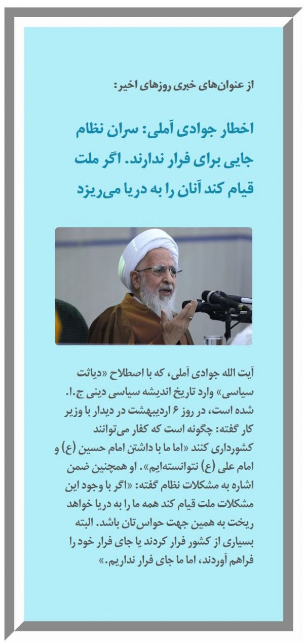 قیام مردم ایران بسیار نزدیک است و هر لحظه وجود آن خواهد بود ، که در زیر ۴ ساعت این آخوندها و مجتهد ها را بکشند و تیکه و پاره بکنند.و هر کسی که جلوی مردم ایران ایستاده است را هم به درک بفرستند ،از الان میگویم نیروهای انتظامی به مردم بپیوندند ،بهتر است از الان سهم خودتان را جدا بکنید و همکاری با مردم بکنید با اعتصابات و نرفتن به سر کار یعنی به مردم پیوسته اید ،که در آینده رحمی وجود نخواهد داشت.