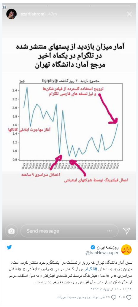 روز گذشته اعلام شد میزان بازدید از پستهای تلگرام که به دنبال فیلتر کردن کم شده بود، به دلیل استفاده مردم از فیلترشکن دوباره در حال افزایش است.محمدجواد آذری جهرمی، وزیر ارتباطات ایران چند روز پیش گفته بود کاربران شبکههای اجتماعی در ایران در برابر دستور قضایی در مورد استفاده از فیلترشکنها مقاومت میکنند.