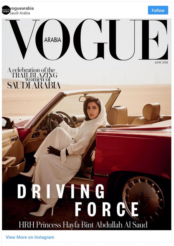 این شماره از مجله ووگ عربی در آستانه لغو ممنوعیت رانندگی زنان در عربستان منتشر شده است.