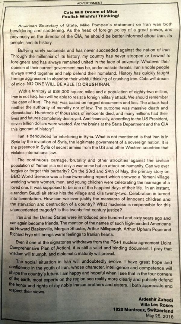 در واکنش به سخنرانی آقای پامپئو، آقای زاهدی روز پنجشنبه ۳۱ ماه مه ۲۰۱۸ مقاله یی را در روزنامه نیویورک تایمز منتشر کردند. چون این روزنامه حاضر به انتشار آن در صفحه مقالات مهمان نبود، آقای زاهدی آنرا بصورت "آگهی" با صرف هزینه هنگفت [از جیب خود] در آن روزنامه منتشر کردند. لزومی ندارد با بخشی و یا تمامی آنچه که ایشان نوشته اند مخالفت کرد و یا موافق بود. به گمان نگارنده مهم میهندوستی اصیل ایشان است.