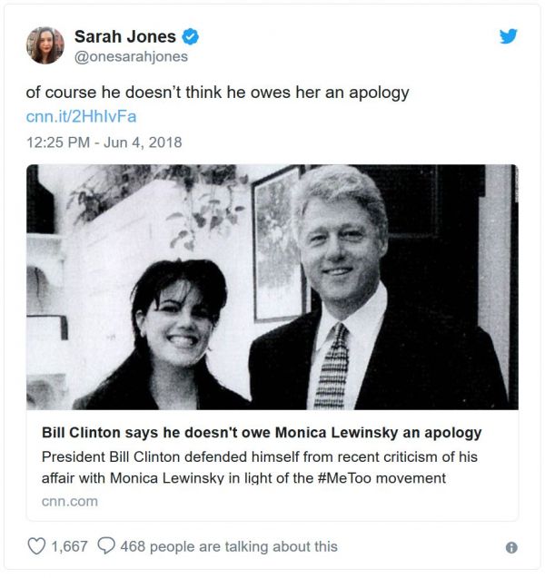 بیل کلینتون، رئیس جمهوری سابق ایالات متحده میگوید که به مونیکا لوینسکی، کارآموز کاخ سفید که با وی رابطه داشت عذرخواهی بدهکار نیست.رئیس جمهوری سابق ایالات متحده در مصاحبه با شبکه خبری انبیسی در پیوند با انتقاداتی که در راستای جنبش #MeToo از وی شده بود، از عدم استعفا و ماندن خود در کاخ سفید دفاع کرد.