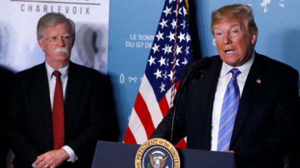 جان بولتون، مشاور امنیت ملی دونالد ترامپ، هنگام سخنرانی در کنار او حاضر بود دونالد ترامپ، رئیس جمهور آمریکا، در سخنرانی پایانی خود در اجلاس سران گروه ۷ گفت با همکاری اعضای این گروه یا بدون آنها "بلندپروازیهای هستهای" ایران را مهار خواهد کرد.آقای ترامپ در حالی که زودتر از دیگر رهبران کشورهای گروه ۷ این اجلاس را ترک میکرد، گفت: "ملل گروه ۷ به مهار بلندپروازیهای هستهای ایران متعهد میمانند. با همراهی آنها یا بدون آنها، آن بلندپروازیها مهار خواهند شد."