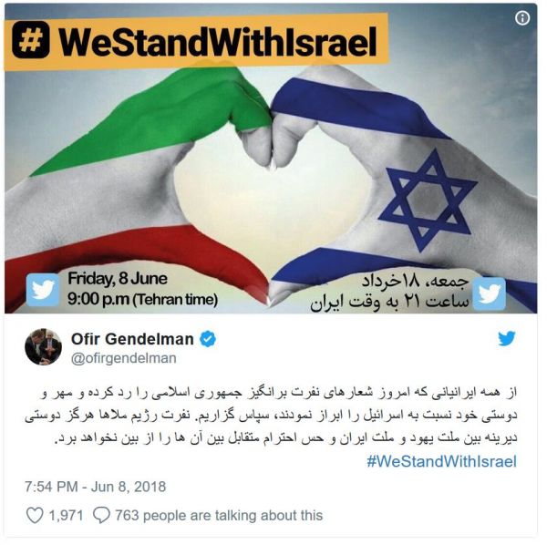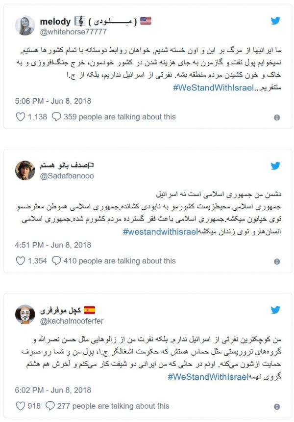 صدای آمریکا :جمعی از کاربران ایرانی توییتر همزمان با برپایی راهپیمایی حکومتی «روز قدس» در ایران با سیاستهای ضد اسرائیلی جمهوری اسلامی مخالفت کرده و اعلام کردند با اسرائیل همراهی بیشتری دارند تا با حکومت جمهوری اسلامی ایران.این کاربران در پی یک فراخوان توییتری جمعه شب به وقت تهران مطالبشان را با استفاده از هشتگ WeStandWithIsrael به اشتراک گذاشتند و سخنگوی نخست وزیر اسرائیل این از این حرکت قدردانی کرد.