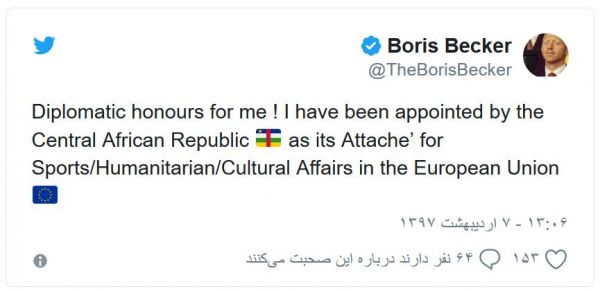 بوریس بکر، قهرمان سابق تنیس جهان مدعی داشتن مصونیت دیپلماتیک برای مقابله با تلاشها برای شکایت از او شده است.بوریس بکر که سه بار برنده جام ویمبلدون شده گفته است دیپلمات کشور جمهوری آفریقای مرکزی است و این به منزله مصونیت دیپلماتیک او در برابر هر نوع شکایت حقوقی است.