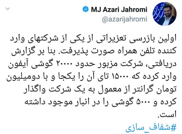 انتخاب : وزیر ارتباطات در توییت خود از اولین بازرسی صورت گرفته در یکی از شرکتهای واردکننده گوشی تلفن همراه گزارش داد. این شرکت ارز دولتی دریافت کرده ولی کالاهای خود را دومیلیون گران تر فروخته استافشاگری جهرمی وزیر ارتباطات از اولین بازرسی صورت گرفته در یکی از شرکتهای واردکننده گوشی تلفن همراه گزارش داد این شرکت ارز دولتی دریافت کرده ولی کالاهای خود را دومیلیون گران تر فروخته است