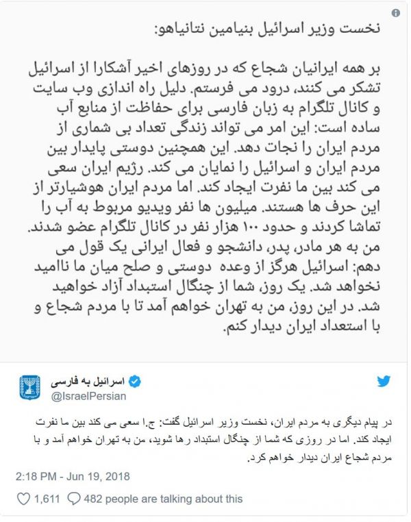 بنیامین نتانیاهو در حساب توئیتری این دولت به فارسی نوشت که جمهوری اسلامی سعی می کند بین ما نفرت ایجاد کند. اما در روزی که شما از چنگال استبداد رها شوید، من به تهران خواهم آمد و با مردم شجاع ایران دیدار خواهم کرد.