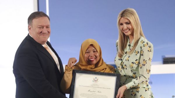 در این نشست چند نفر از جمله یک زن فعال ضد قاچاق انسان از اندونزی مورد تقدیر وزیر خارجه آمریکا و ایوانکا دختر و مشاور پرزیدنت ترامپ قرار گرفت. مایک پمپئو، وزیر خارجه آمریکا و ایوانکا ترامپ دختر پرزیدنت ترامپ و مشاور او در مراسمی به مناسبت انتشار گزارش سالانه قاچاق انسان در وزارت خارجه آمریکا شرکت کردند.در این گزارش از کشورها خواسته شده است ضمن شناسایی قاچاقچیان انسان و قربانیان آنها با اقدامات فردی و بین المللی به نابودی پدیده قاچاق انسان کمک کنند.