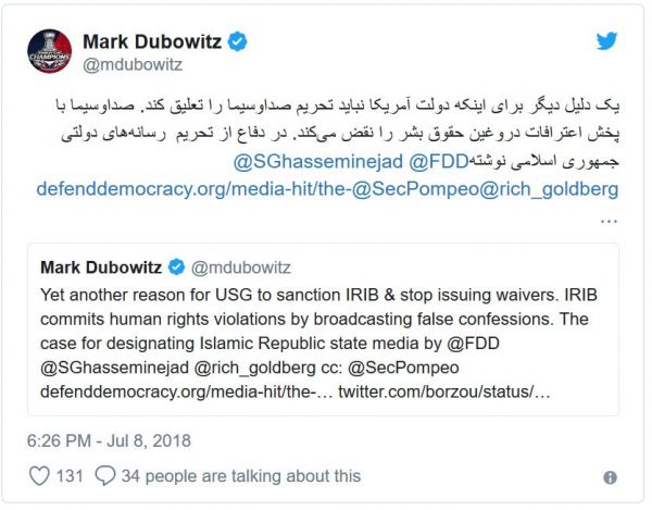 مارک دوبوویتز: دولت آمریکا باید رادیو و تلویزیون دولتی ایران را تحریم کند