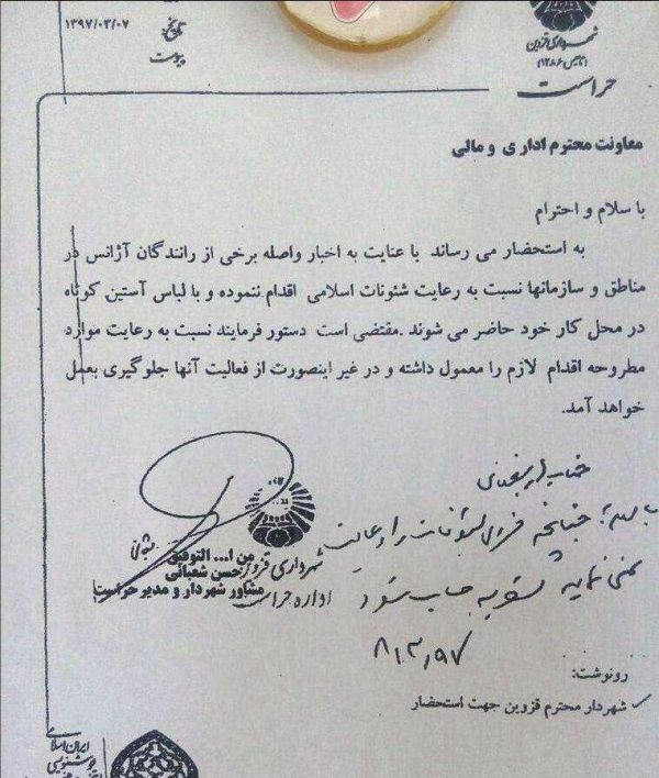 انتشار تصویر بخشنامه ای که از ممنوع شدن پوشیدن پیراهن آستین کوتاه برای رانندگان تاکسی در قزوین خبر می دهد.