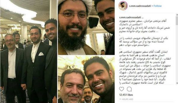 او در صفحه اینستاگرام خود نوشته بود: «آقای سفیر جمهوری اسلامی... از آنجا که امام فرمودند اگر مسئولین از کوخنشینی به کاخنشینی رفتند باید فاتحه جمهوری اسلامی را خواند. سوال من این است که یک هزارم ملت هم نمیتواند در لاکچریترین سالنهای کشور (دانیال، شهرک غرب) و با ماشین بنز برای فرزندشان مراسم بگیرند. آیا شما خود را مسئول جمهوری اسلامی نمیدانید یا قرار است فاتحه جمهوری اسلامی [را خواند؟]».مهدی صدرالساداتی و محسن مرادیان، بارها در فضای مجازی با یکدیگر به گفتگو پرداخته و همدیگر را به افشای موضوعات خانوادگی، اسیدپاشی و اقدامات قضایی تهدید کرده بودند. این موضوع تهدیدات متقابل میان هواداران آنها را نیز در پی داشت. بالا گرفتن این جنجالها، سفیر ایران را ناچار به صدور بیانیه و درخواست دخالت مدرسی یزدی برای پایان دادن به این غائله کرد.